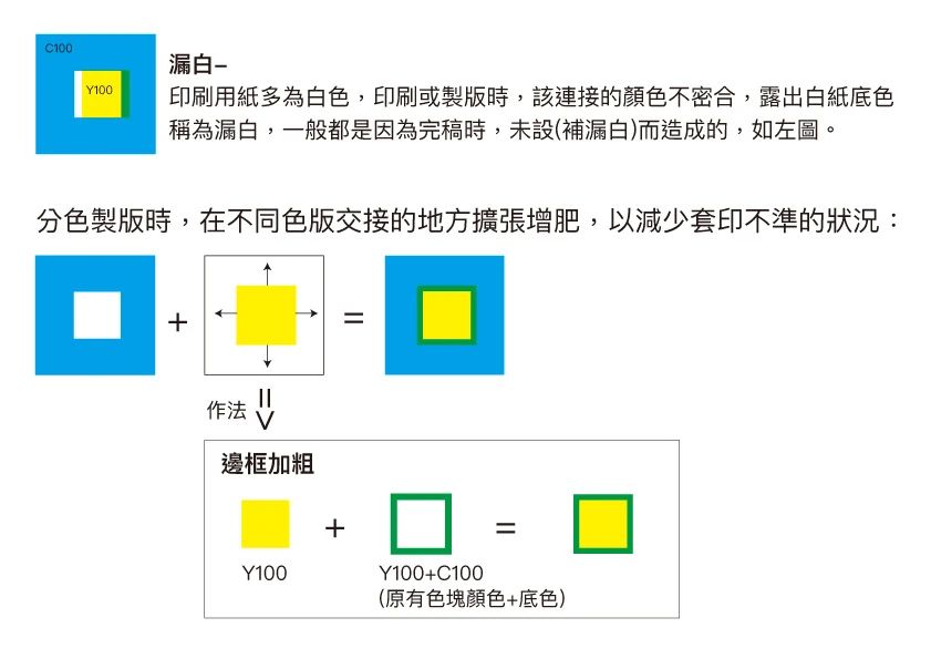 陷印也叫补漏白,又称为扩缩,主要是为了弥补因印刷套印不准而造成两个相邻的不同颜色之间的漏白。 当人们面对印刷品时,总是感觉深色离人眼近,浅色离人眼远,因此,在对原稿进行陷印处理时,总是设法不让深色下的浅色露出来,而上面的深色保持不变,以保证不影响视觉效果。