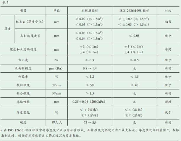 GB/T 33248—2016《印刷技术 胶印橡皮布》基本保留国际标准中有关厚度、表面状态、伸长率、抗拉强度、压缩性能、厚度变化、硬度等方面的核心技术数据。起草组专家结合国内市场上普遍使用的四十余个橡皮布品牌的上百个样本中对上述数据的实际测试结果,从标准使用者原则出发,确定出具体的数值和允差等要求。数据比较详见表1。