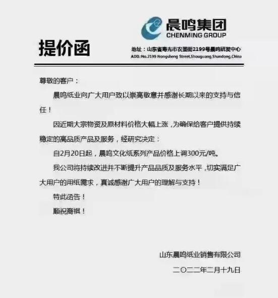 太阳纸业:2022年3月1日起涂布类全系列,非涂布类全系列产品在目前的政策价格基础上上调300元/吨。 APP文化用纸:2022年3月1日起,金东、金海全系列纸种价格在2月份基础上调300元/吨。 晨鸣纸业:2022年2月20日起,文化纸全系列涨300元/吨。 岳阳林纸:2022年2月21日起,文化,全线产品涨价300元/吨。 美利云:2022年02月21日起,文化纸全系列涨300元/吨。 银河纸业:2022年2月21日起,文化用纸全系列涨价300元/吨。 天和纸业:2022年2月10日起,全系列产品上调价格200元/吨。