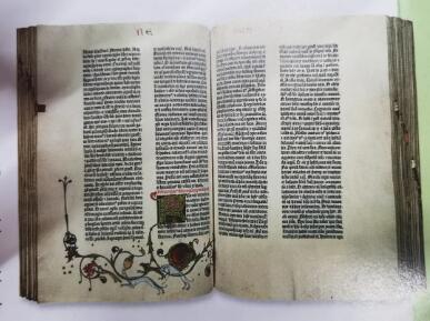早期的印刷书籍,比如这本《谷登堡圣经》,排版设计都是模仿手抄本的。印刷字母通常用手工加工加以美化,配上精致的色彩配图。 |
