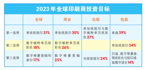 在印刷技术方面,2023年的明显赢家将是单张胶印,占比31%,其次是数字碳粉单页纸彩色(18%)与数字喷墨宽幅和柔印(17%)。单张纸胶印机仍是2023年最受欢迎的投资项目,尽管在部分市场其印刷量明显下降,但对部分印刷商来说,使用单张纸胶印机可减少劳动力和浪费,提高产能。