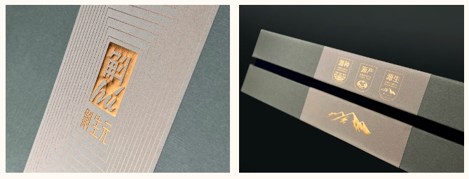小象智合为斛生元设计生产的的这款礼盒就使用烫金工艺对斛生元品牌名和主题画面进行呈现,金属光泽使得“源种、源产、源生”的品牌属性在视觉层面上更加突出,丰富包装层次感,实现画面、工艺与设计主题的完美结合。