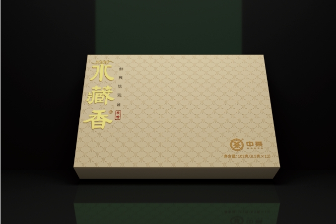 为了使包装视觉语言能更好地进行表达,我们往往会将印刷工艺结合使用,这款水藏香茶叶包装就将烫金击凸工艺相结合,呈现主形象“水藏香”字体,结合“水”字底纹击凸设计,纹理清晰,每一处细节都是呕心沥血、反复推敲的成果。