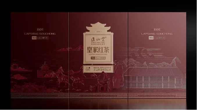 在这款武夷红茶·正山小种茶叶包装上,设计师就采用了局部UV工艺做设计效果。在礼盒的画面视觉营造上,提取中式传统元素构建国风场景,并重点突出关键的图案与文字,经过UV处理后,整体显得更加有立体质感,也更加高档。