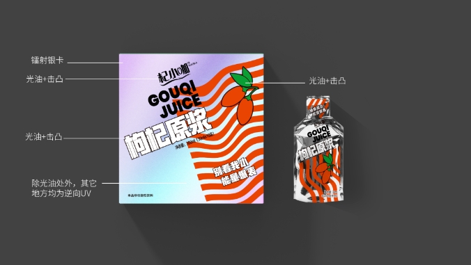 在杞小咖枸杞原浆的包装上,我们就将光油工艺与击凸、逆向UV等印刷工艺结合呈现并与镭射银卡的材质相结合,保障整体设计画面的展现效果的同时,也可以赋予品牌包装更朋克的金属光泽,打造更加新潮的包装。