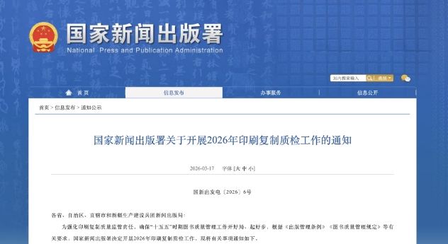 国家新闻出版署启动 2026 年印刷复制质检,文创类印刷品首次纳入专项抽检:3月17日,国家新闻出版署发布《关于开展2026年印刷复制质检工作的通知》,全年质检工作于3月15日启动,首次将文创类印刷产品纳入专项抽检,重点针对青少年关注的热销文创产品,督促企业强化质量管控。本次质检还包括“3・15”印刷复制质检活动、重点出版产品印制质量保障提升行动、中小学重点教材印制和环保质量检查三项重点工作,采取 “即抽即检、即交办即处置” 模式,提升监管效能,推动印刷及文创行业向高质量发展转型。