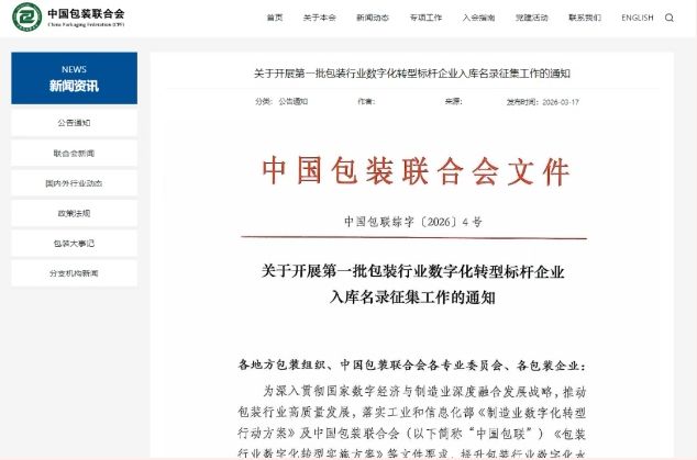 中国包装联合会启动首批数字化转型标杆企业征集:3月17日,中国包装联合会发布了《关于开展第一批包装行业数字化转型标杆企业入库名录征集工作的通知》,组织开展企业入库名录申报相关工作。本次征集旨在贯彻国家数字经济与制造业深度融合发展战略,落实工业和信息化部及中国包装联合会等文件要求,提升包装行业数字化水平,树立技术先进、成效显著、可复制推广的标杆企业,发挥示范引领作用,带动行业数字化转型。