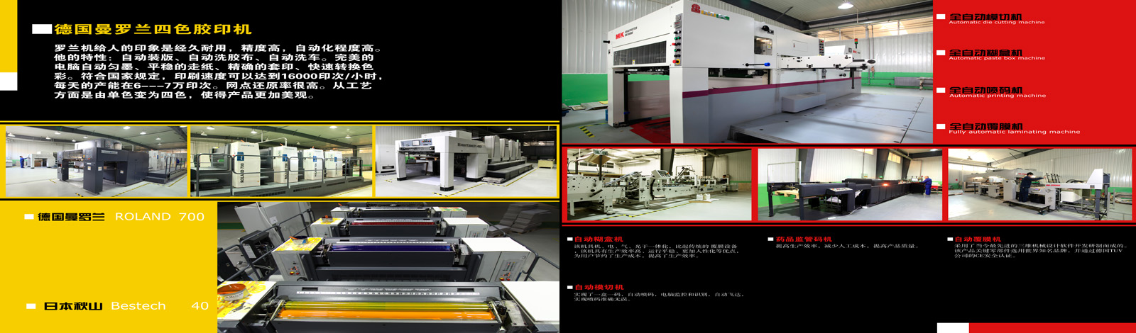 公司拥有德国曼罗兰、日本秋山多色胶印机、自动模切机、自动粘盒机、自动覆膜机、自动..